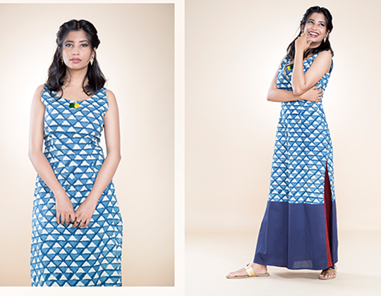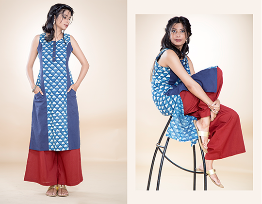 Lakshmi GuptaThe main objective of the project was to combine an academic design process based on research and development with the industrial process according to the customer’s requirements. Conceptualisation and design of the final collection included developing communication material for branding and marketing. Explorations with different kinds of construction possibilities, materials, form, color and texture, detailing and different surface techniques helped shape the final collection. The thirty ensembles of the Indo-western collection had one distinct look based on a youthful theme. Tunics and kurtas made in ethnic block print fabric were targeted for the independent, confident and modern Indian woman.