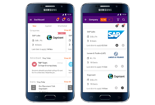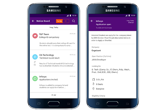 Monica GahloutThis project aimed at bettering the experience of campus placement for the participating students, the training, placement and recruiting teams visiting the campus. Extensive user research and online surveys helped converge onto the pain points and helped evolve a system for the elimination thereof. The final design was in the form of a mobile app to aid the students make more efficient decisions regarding applications as well as keep track of the same at various stages. This was done to ensure management of time and resources on the part of the students as well as the coordinators and facilitate communication between all the three stakeholders.