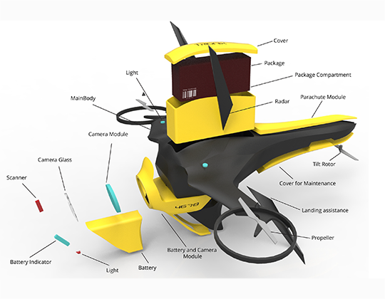 Vivek ChondagarThe central idea was to design Next Generation Drone Delivery System, a network of drones that will be able to deliver packages remotely. Drone technology is advancing very rapidly in all possible sectors. This drone delivery system will speed up the process of delivering packages instantly. The drone was designed around functionality, and user's needs and comfort. Its sleek and aerodynamic form was inspired by the wasp. The drone was designed to carry around 2 kilograms of payload and deliver it safely without any human intervention. Battery life was optimised by making the drone glide. Network of drone stations and virtual map of the city was made to help back up the drone delivery system.