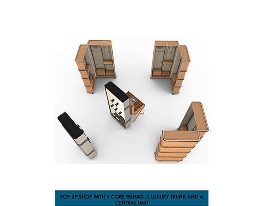 Shruti JainThe project aimed at creating an innovation-driven retail experience by designing an entirely new and exclusive stand-alone, pop-up shop format for atriums, multipurpose transition zones of malls and larger retail environments. The final products were two luxury storage trunks, which boasted ease of dismantling, transportation and assimilation; efficient use of space and lighting; and durability and aesthetics, to name a few. The storage trunks were designed to be display units as well, a customised approach that would be unique to the experience of the brand in question. The scope of work included planning of the areas in and around the island shop including access and design of the interior spaces, the development of shell/skin areas and installation of signage and branding elements.