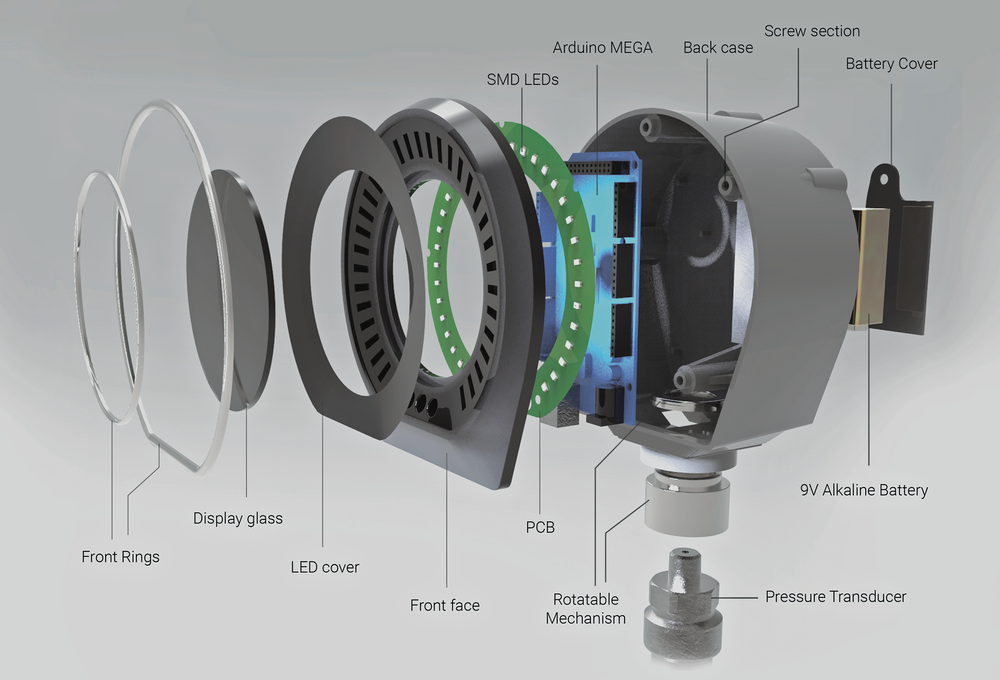 Shishir designed a full-fledged working proof of concept which was developed and tested. 3D printed mock-ups with thermocol models were made. The final product allowed usage with wireless communication, through an application. Readability was enhanced, reflection was reduced and on-spot unit conversion was made accessible. Parallax error was solved and a rotatable mounting feature enhanced the ergonomics of the gauge. A bold design element gave it a premium finish.