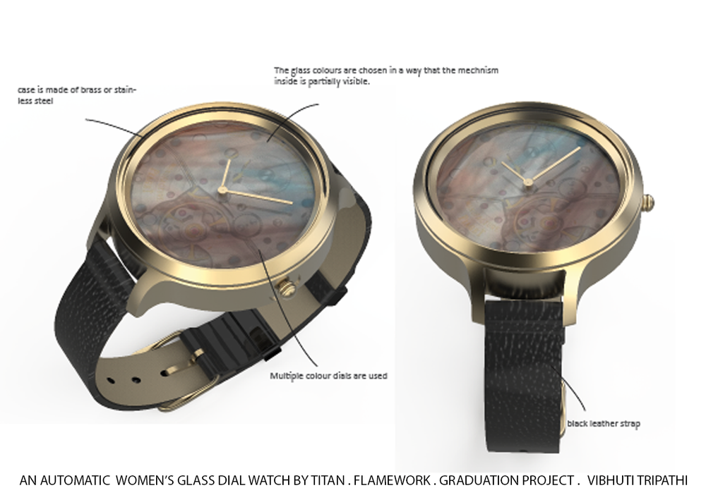 The aim of Vibhuti’s project included developing glass wrist watch dials and cases for Titan. The project focused on designing a range of glass watches along the lines of material exploration, incorporating the difficulties of manufacturing and celebrating the watchmaking process with great engineering. It involved collecting information from celebrity fashion trends, analysis of the watch industry, understanding the associated materials and manufacturing process and studying the relationship between people and material association.