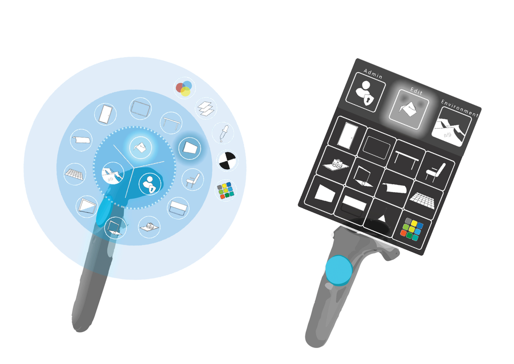 Functional possibilities with VR headset and handset through toolkit design and its elements like 2D and 3D icons, menu palette and gestures were defined. The feasibility of elements in the coding of the application was explored and validated by studying design principles and guidelines on VR applications, case studies and process design, with raw prototyping. The Information Architecture of user, administration and toolkit along with the visual wireframe of the application was designed to show the workflow.