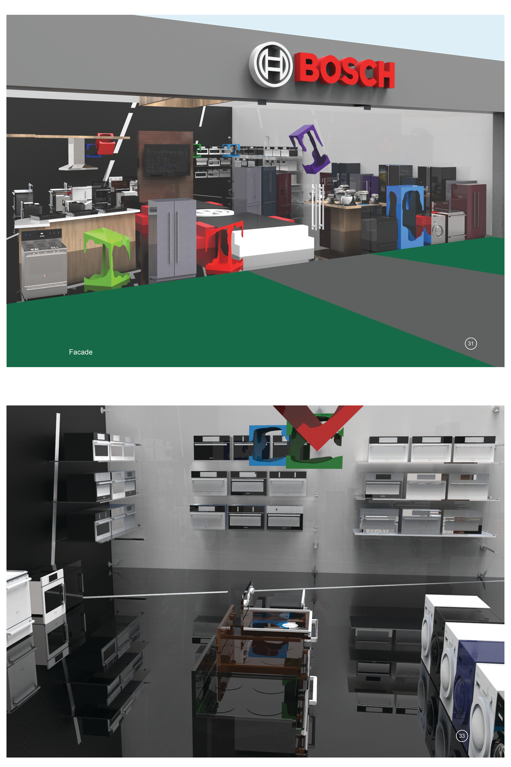The project, though self-sponsored and not commissioned by Bosch Inc., aimed to design a flagship store for the appliances segment of Bosch. Primary research included personal interviews with prospective customers and visits to several Bosch as well as competitors’ stores. This helped in forming the design brief which primarily focused on providing a memorable visceral experience to customers, which would help build better customer engagement